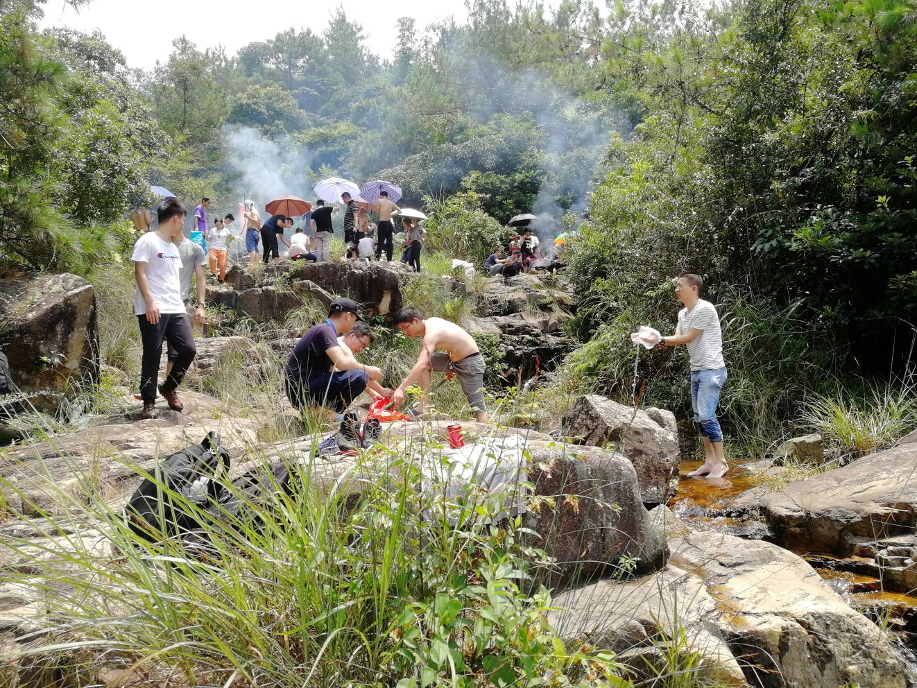下車后,打開行李廂就看到了教練準備的午餐需要的食材,雞鴨魚肉,新鮮蔬菜樣樣俱全,大家都打開了背包自覺的扛起了背負食材的重任。流楓溪是一條經典但非常規的戶外路線,陡峭的溪谷,遍布四處的河灘,上山時要求大家溯溪而上。攀爬了將近3個小時,你早已分不清哪些是汗水哪些是溪水,一路上大家四肢并用,食材、鍋具相互傳遞,鞋子早已經濕了無數次。中途有三三兩兩的小伙伴累趴了,停下休息。但大家相互協作,相互扶持,所幸全員登頂。陽光總在風雨后,登頂后站在高處,仰望藍天白云,遠山如黛,風吹過帶來絲絲涼意,令人更覺溯溪的難能可貴。